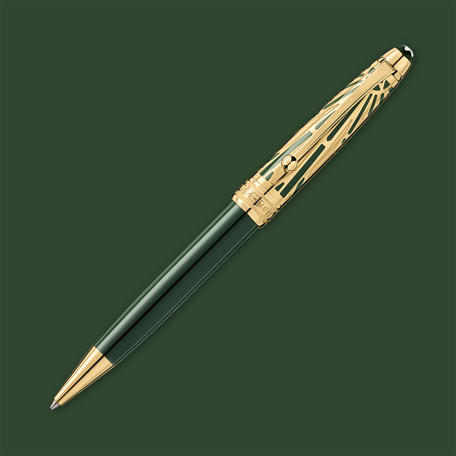 Expertly crafted from dark green precious resin, the cap features a fluid pattern inspired by early designs, representing the dissolution of ink onto paper, elegantly contrasted by gold-coated fittings. The clip is an homage to early clip shapes found in some of the first Meisterstück writing instruments, evoking a sense of nostalgia. Upon closer inspection, one can discover the original Meisterstück logo, which has adorned the cap as a symbol of high quality since its inception. This jubilee edition is decorated with a special cap ring showing the years 1924 and 2024 . Here's to another 100 years of excellence with Meisterstück!